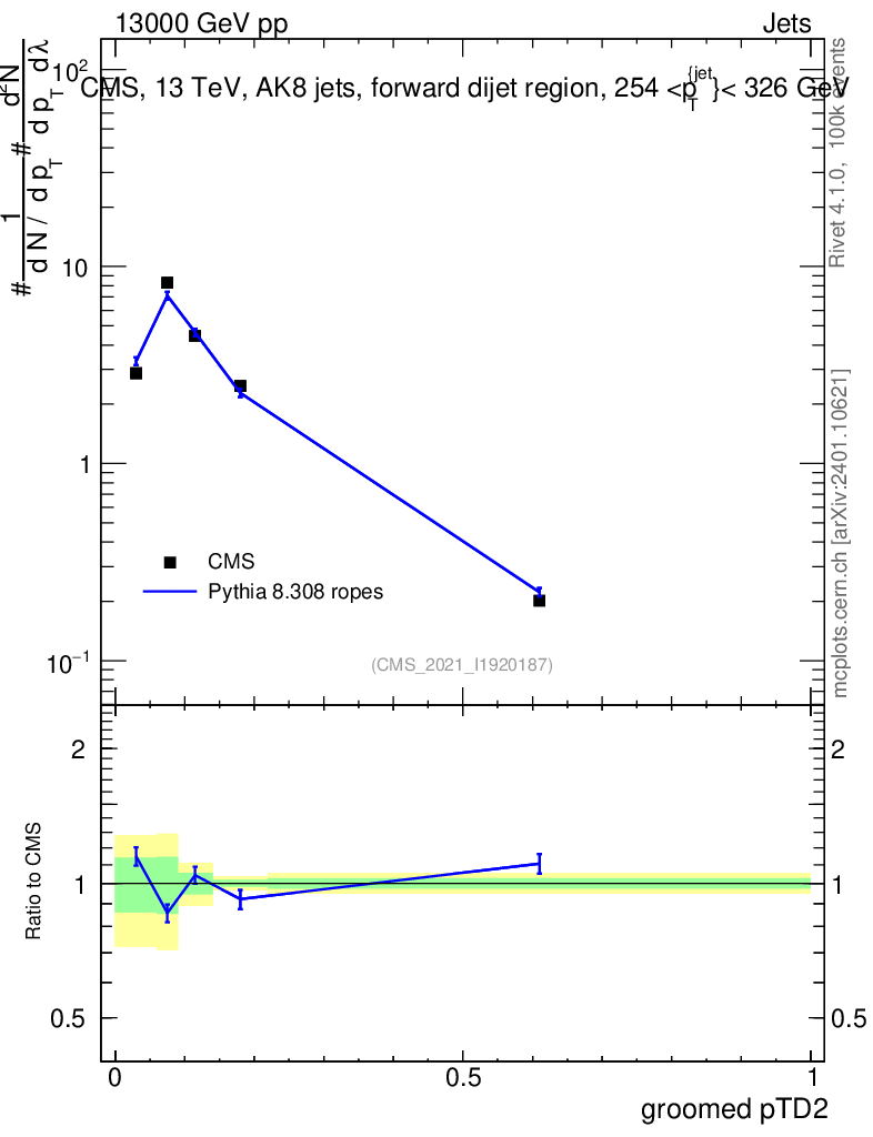 Lines: data, pythia8 8.308 ropes |