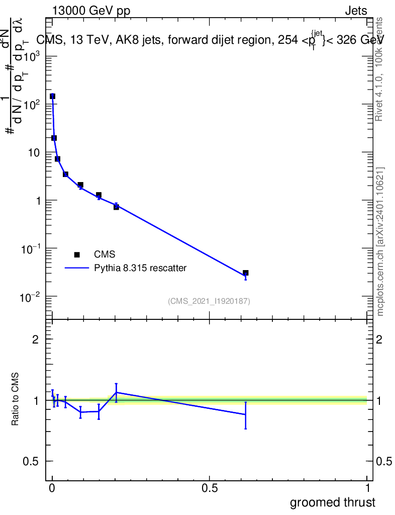 Lines: data, pythia8 8.315 rescatter |