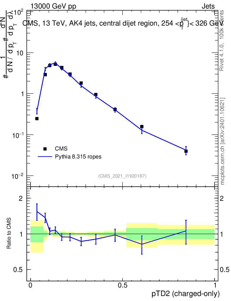 Lines: data, pythia8 8.315 ropes |