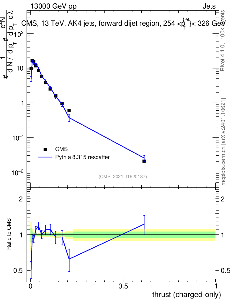 Lines: data, pythia8 8.315 rescatter |