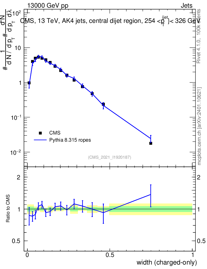 Lines: data, pythia8 8.315 ropes |