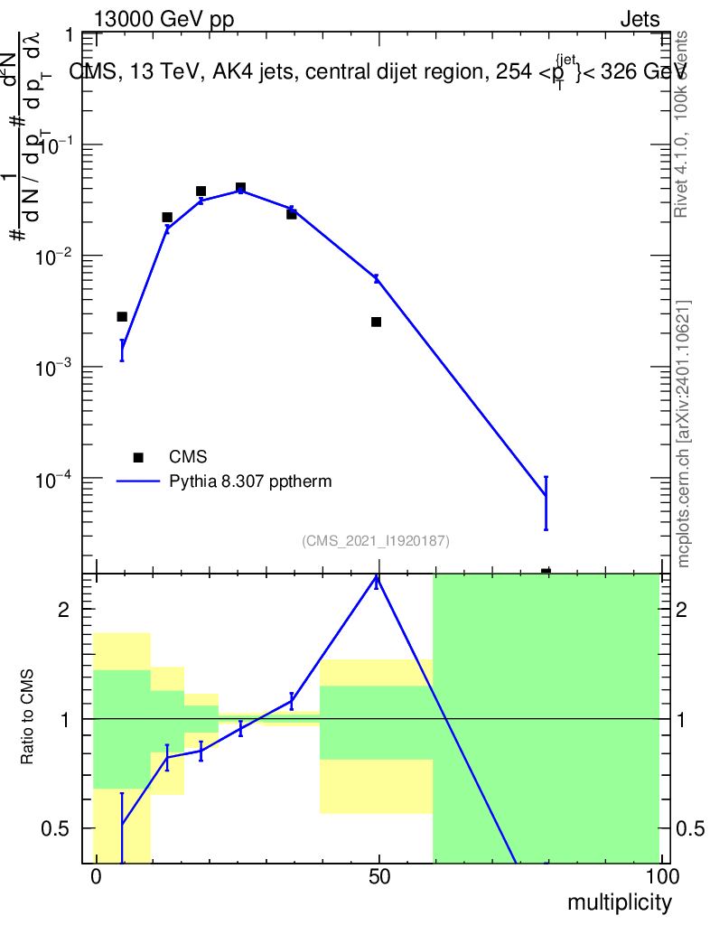 Lines: data, pythia8 8.307 pptherm |