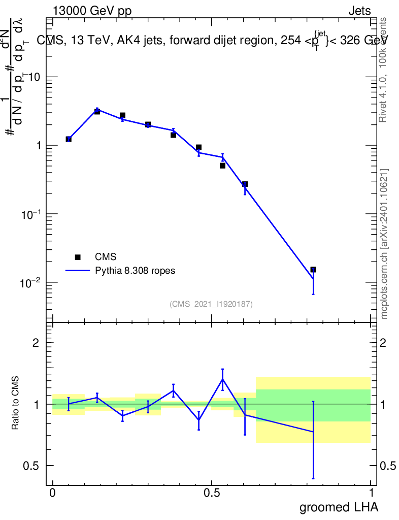 Lines: data, pythia8 8.308 ropes |