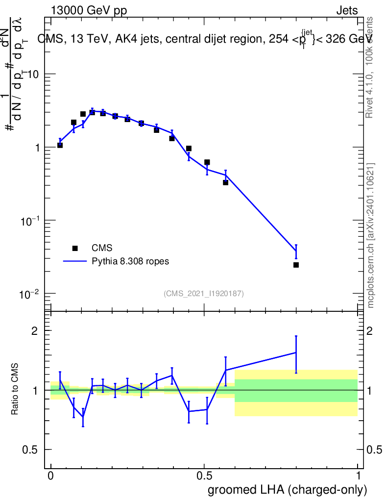 Lines: data, pythia8 8.308 ropes |