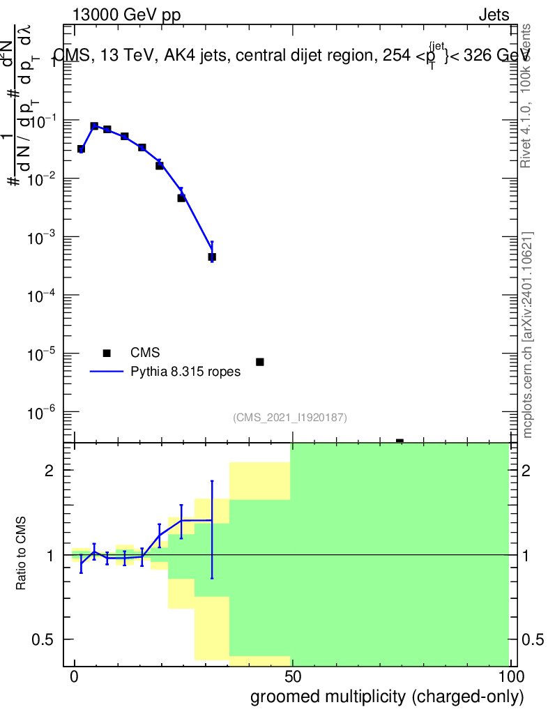 Lines: data, pythia8 8.315 ropes |