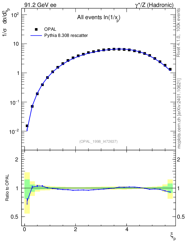 Lines: data, pythia8 8.308 rescatter |