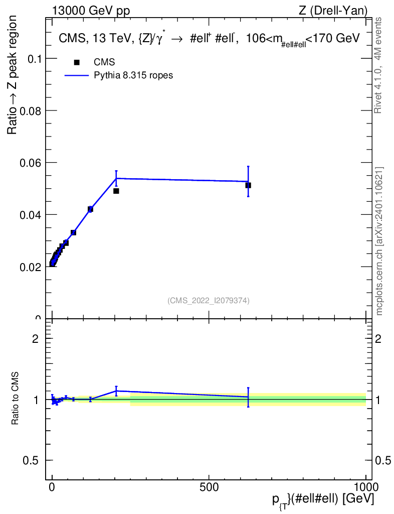 Lines: data, pythia8 8.315 ropes |
