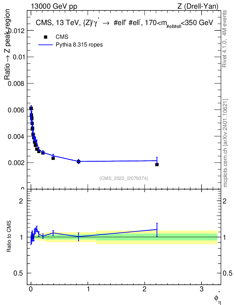 Lines: data, pythia8 8.315 ropes |