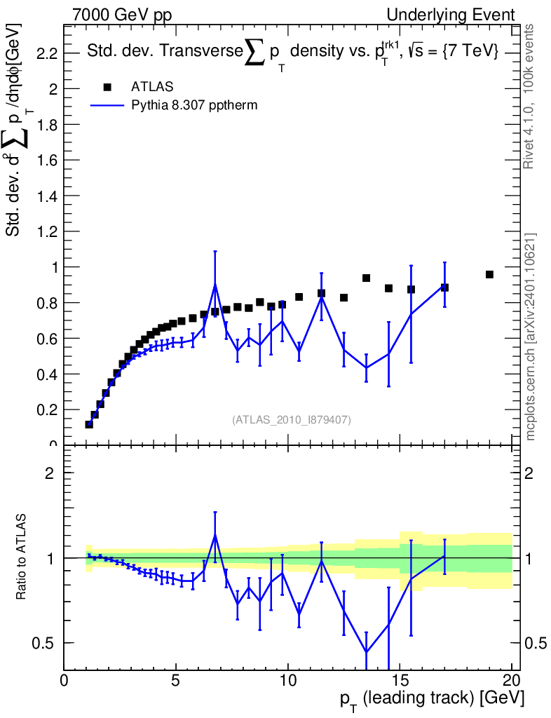 Lines: data, pythia8 8.307 pptherm |