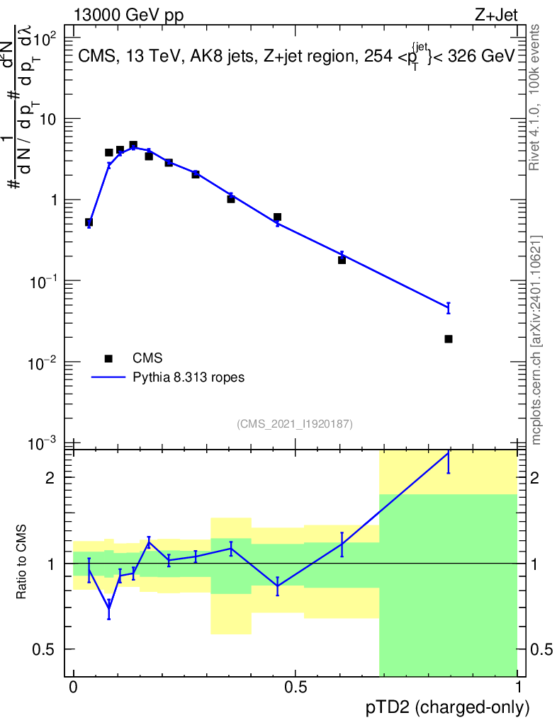Lines: data, pythia8 8.313 ropes |