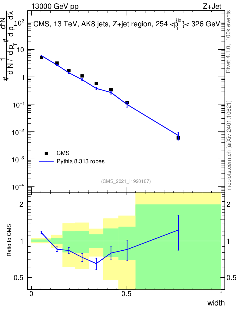 Lines: data, pythia8 8.313 ropes |