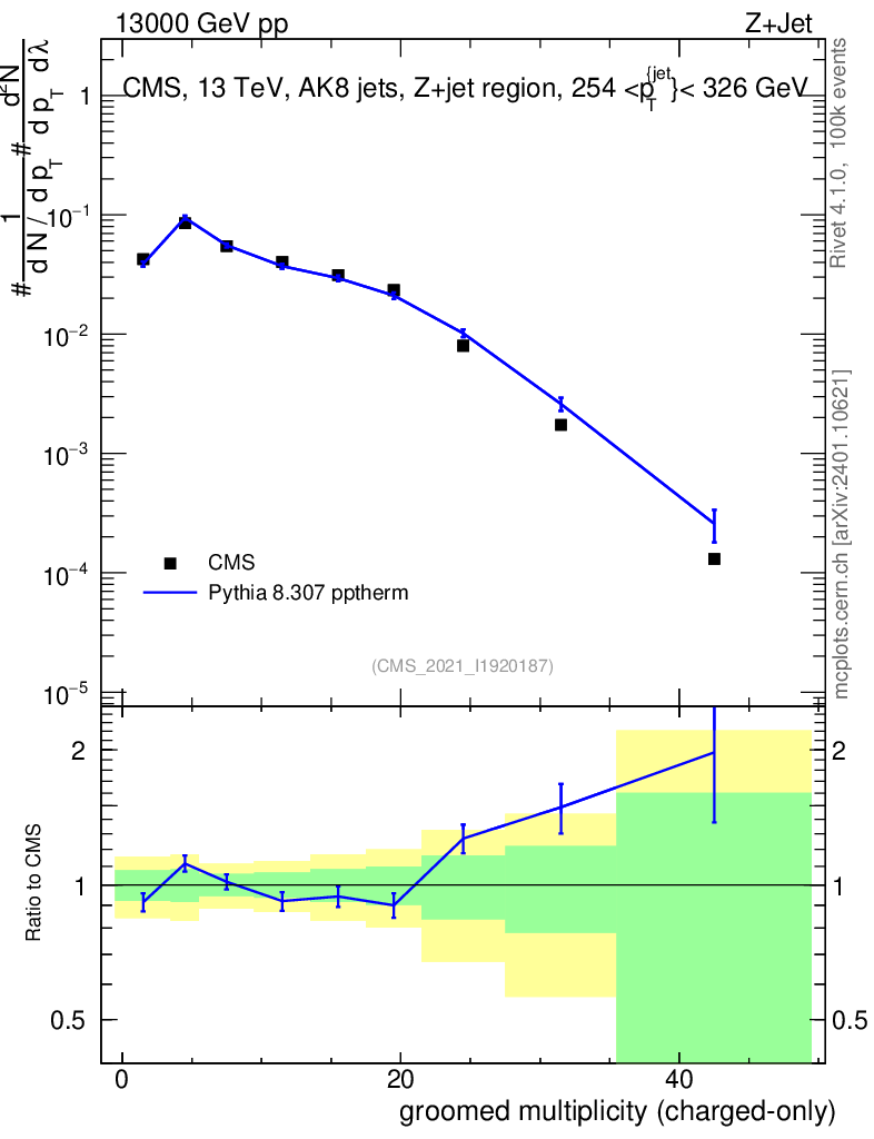 Lines: data, pythia8 8.307 pptherm |