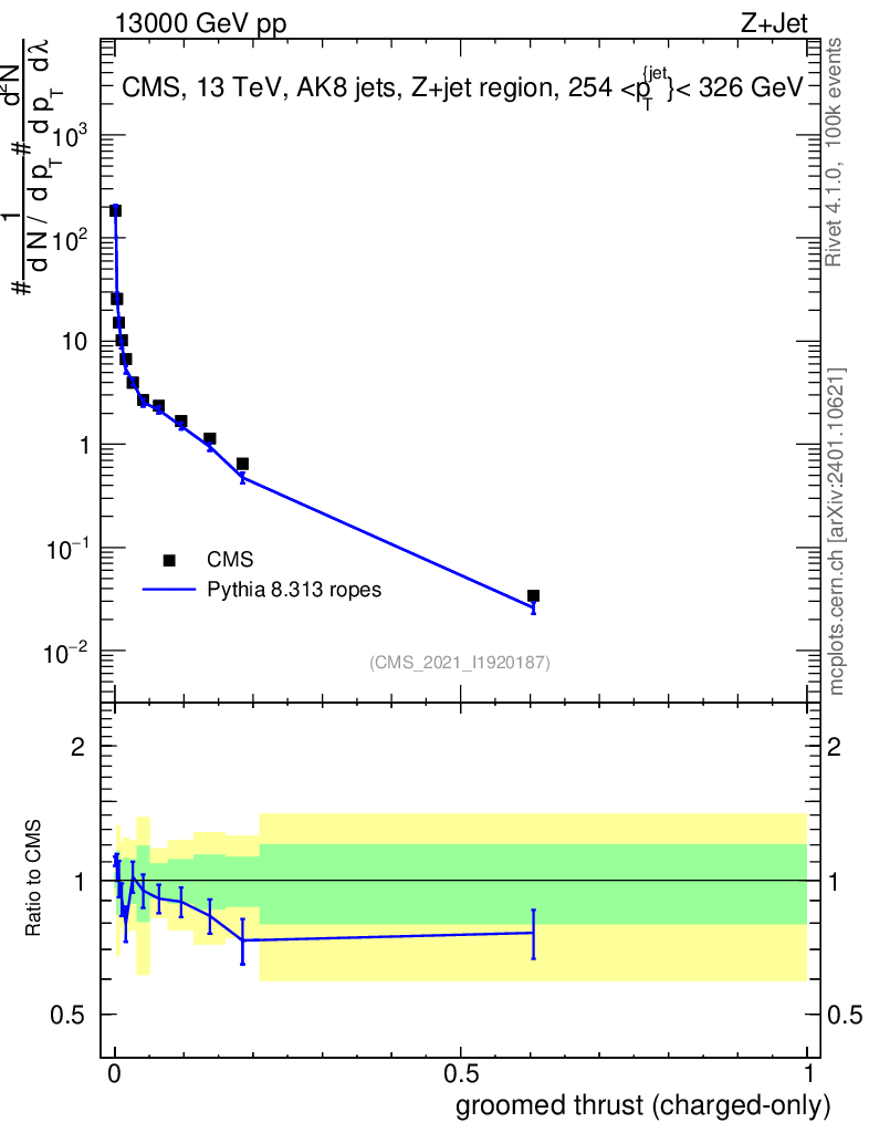 Lines: data, pythia8 8.313 ropes |