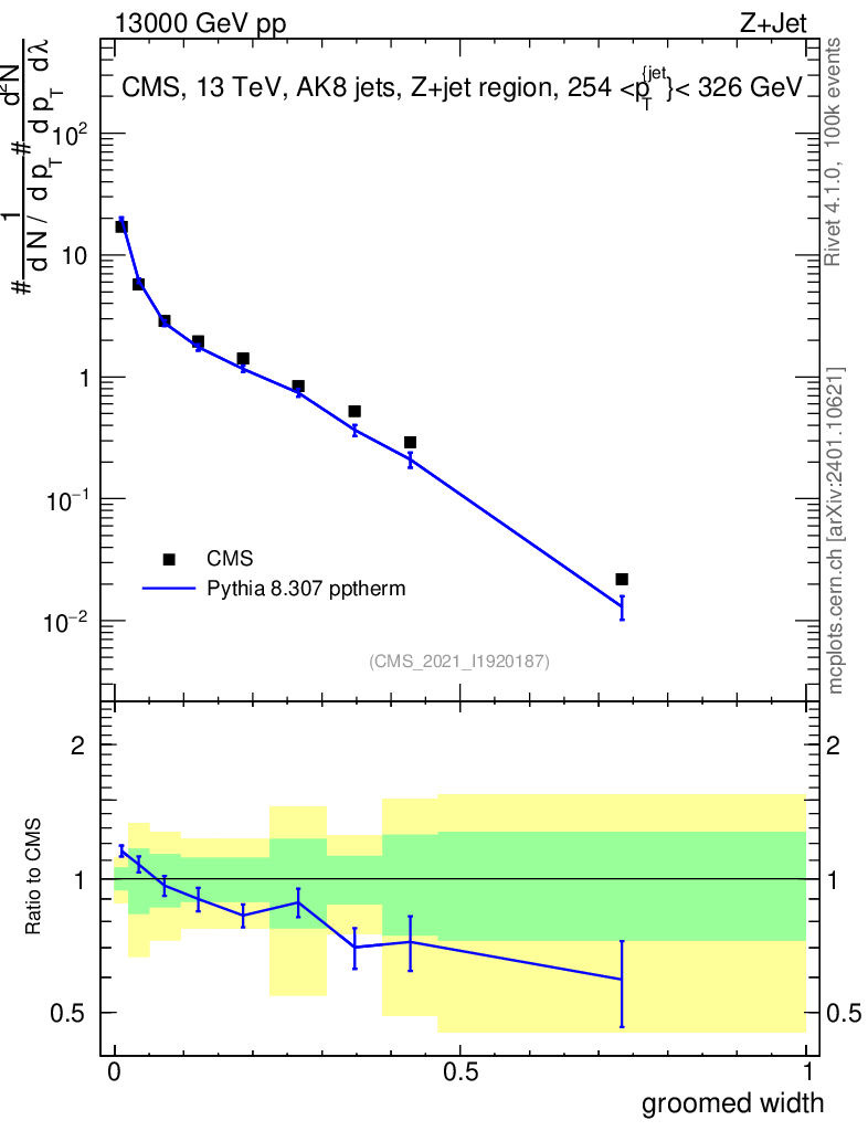 Lines: data, pythia8 8.307 pptherm |