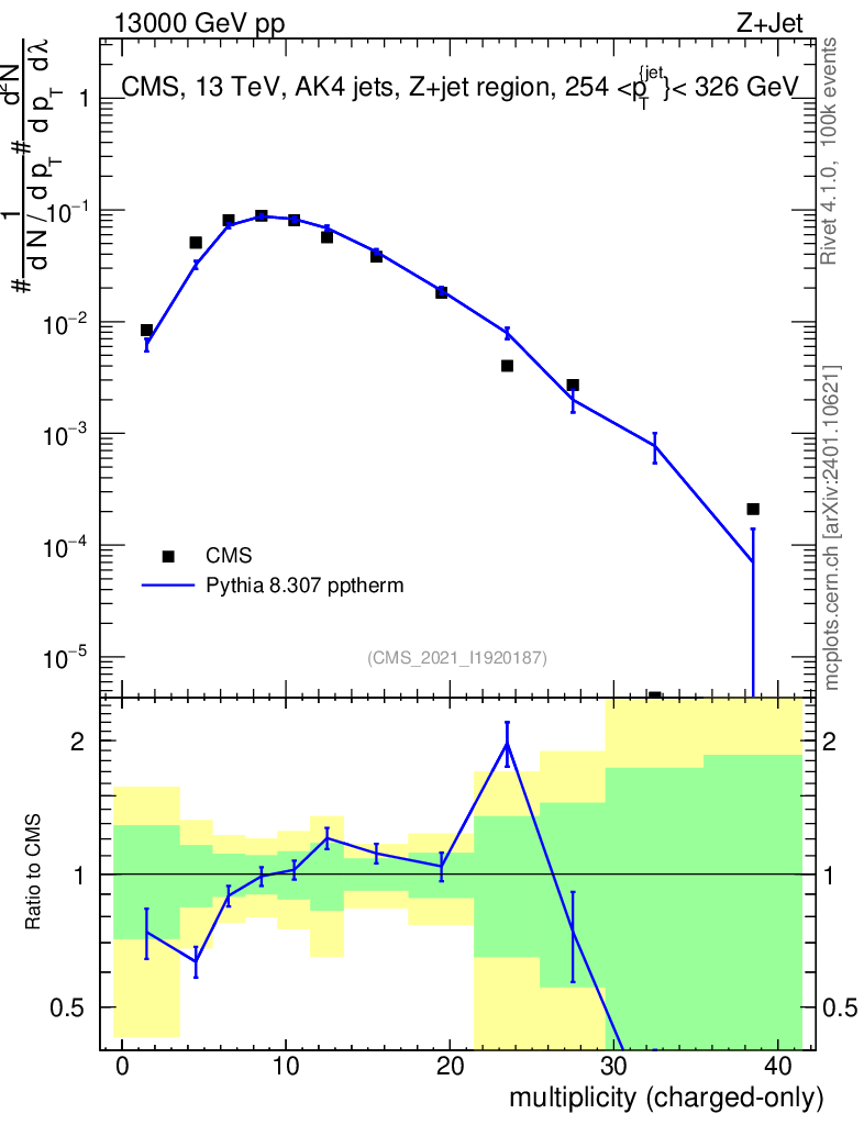 Lines: data, pythia8 8.307 pptherm |