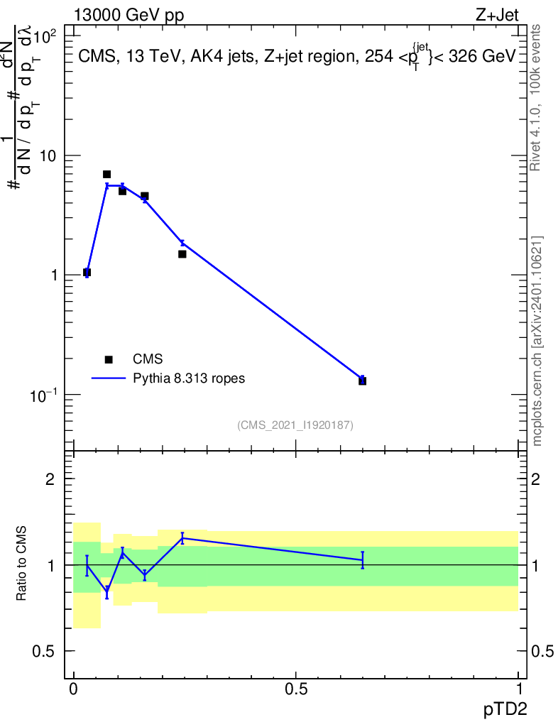 Lines: data, pythia8 8.313 ropes |