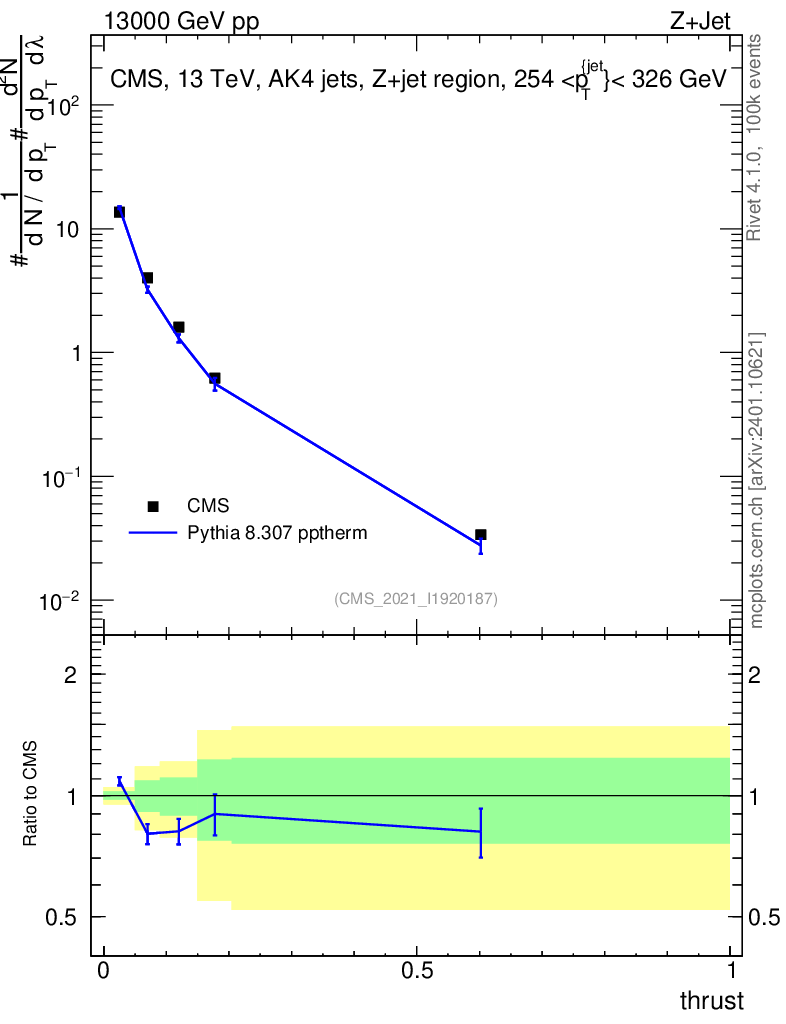 Lines: data, pythia8 8.307 pptherm |