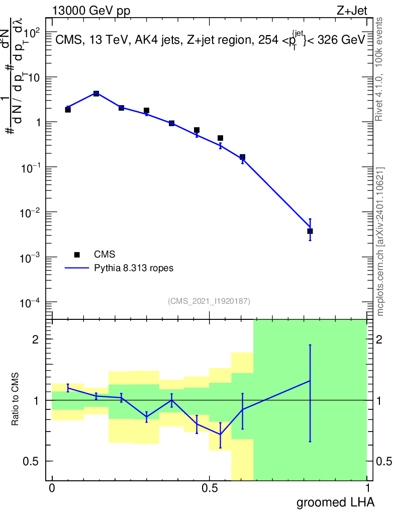 Lines: data, pythia8 8.313 ropes |