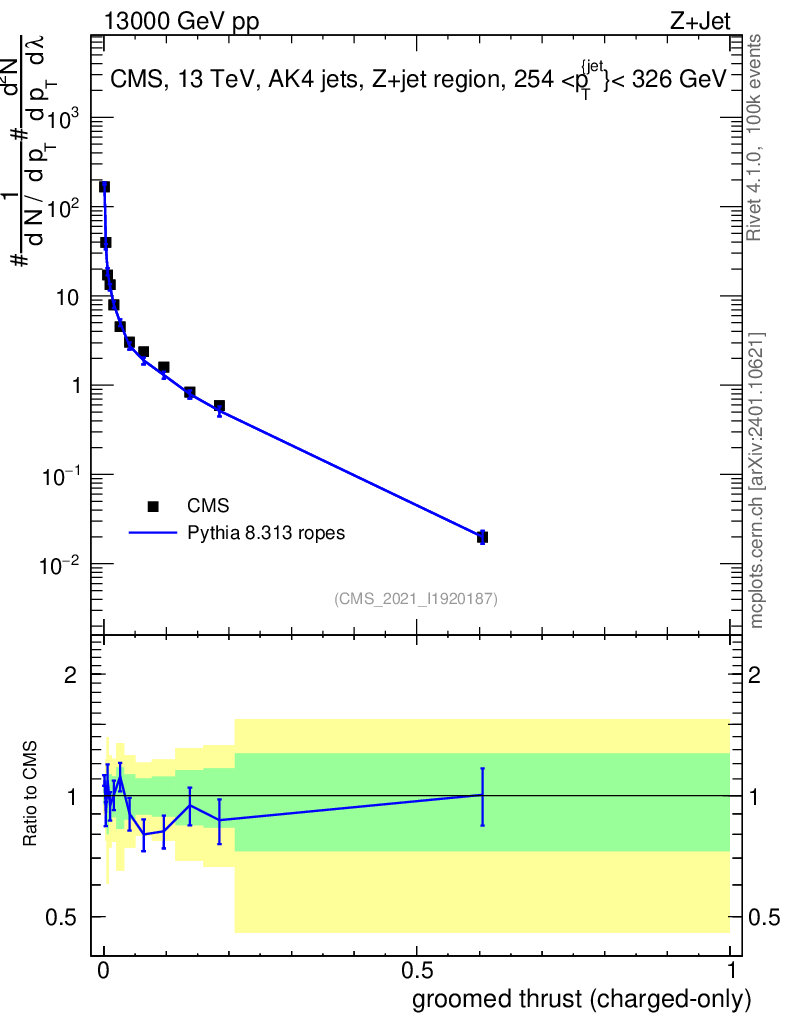 Lines: data, pythia8 8.313 ropes |
