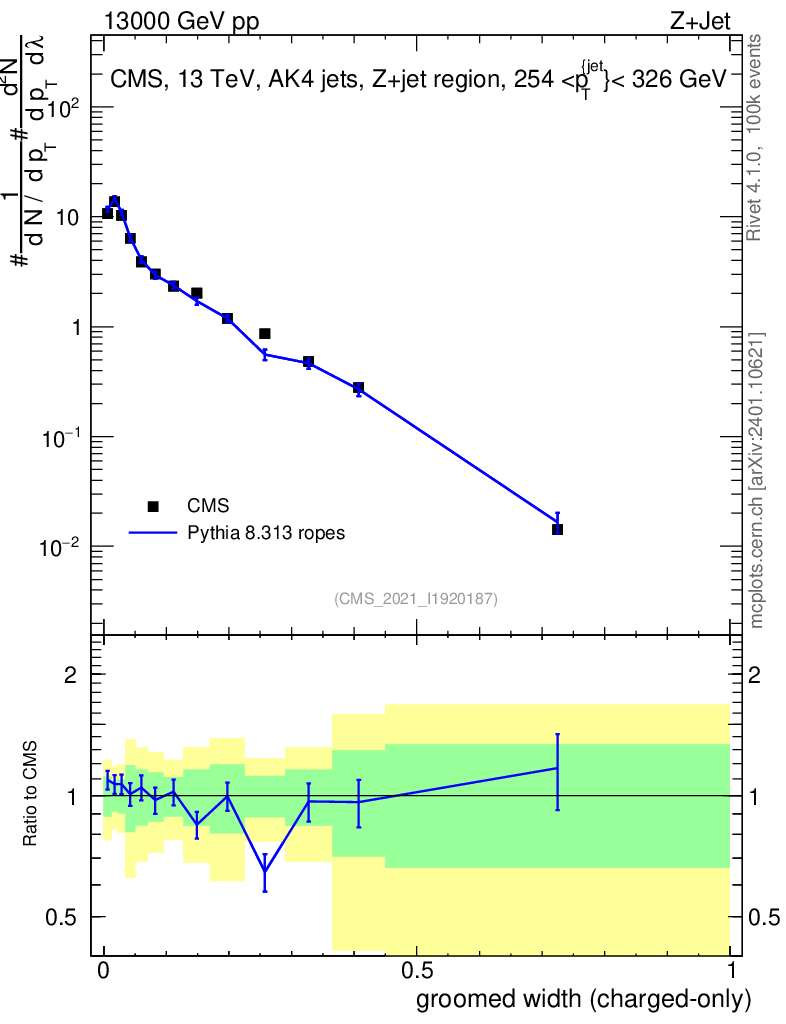 Lines: data, pythia8 8.313 ropes |