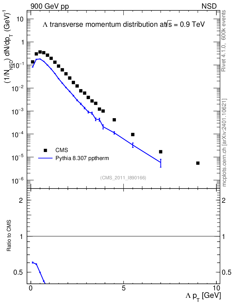 Lines: data, pythia8 8.307 pptherm |