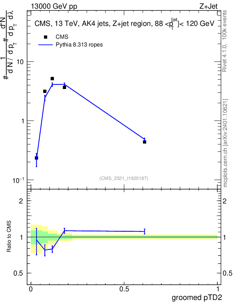 Lines: data, pythia8 8.313 ropes |