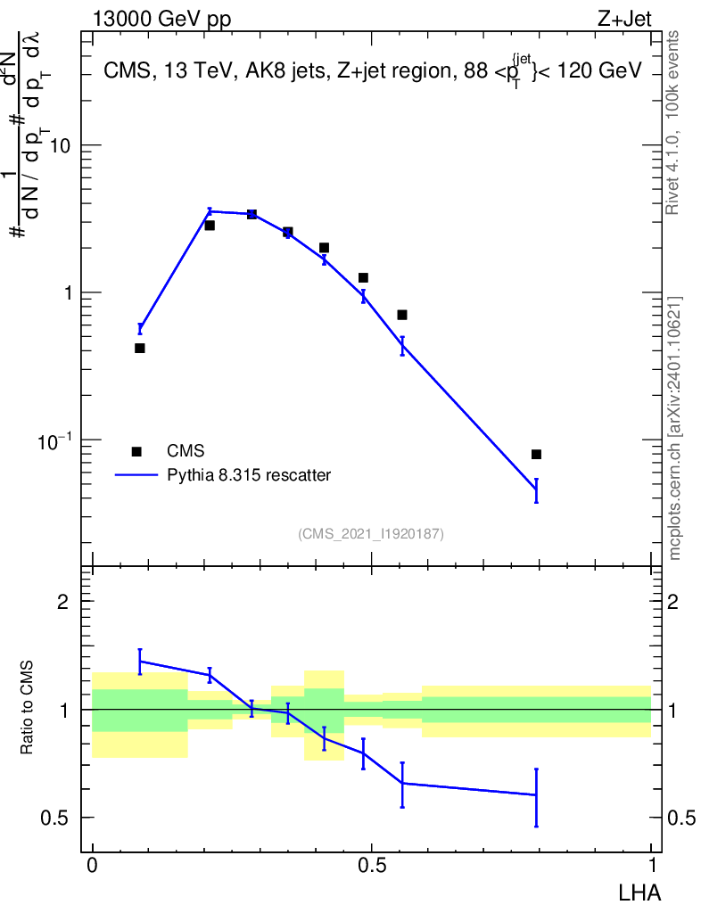 Lines: data, pythia8 8.315 rescatter |