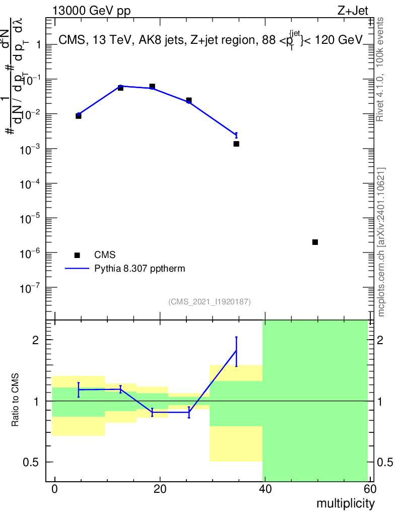 Lines: data, pythia8 8.307 pptherm |