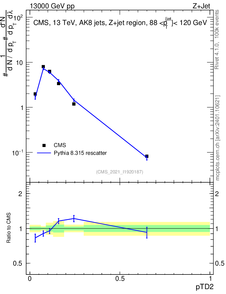 Lines: data, pythia8 8.315 rescatter |