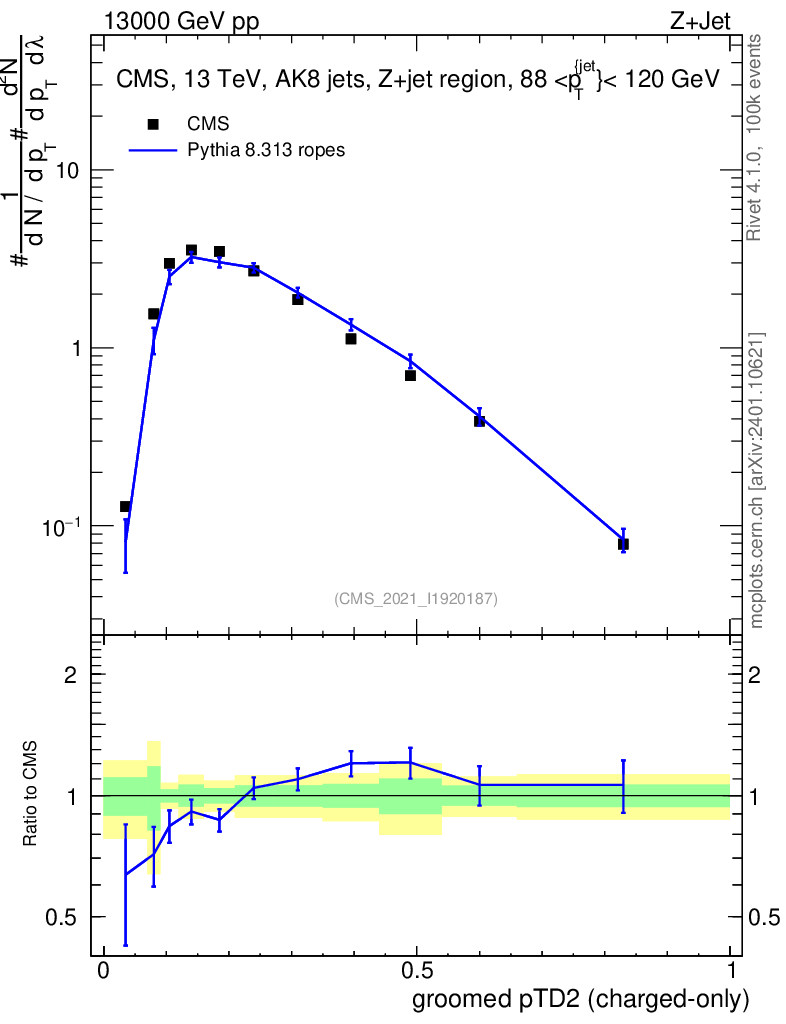 Lines: data, pythia8 8.313 ropes |