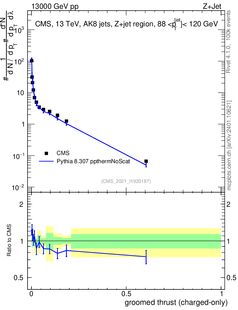 Lines: data, pythia8 8.307 ppthermNoScat |