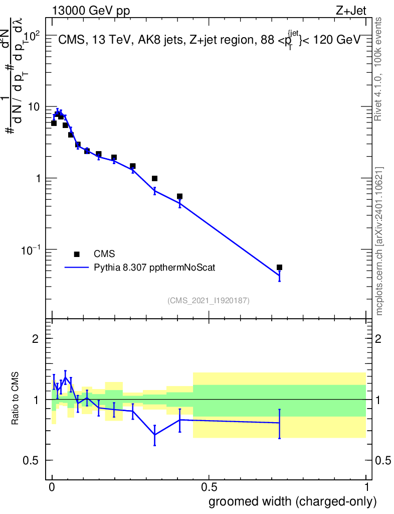 Lines: data, pythia8 8.307 ppthermNoScat |