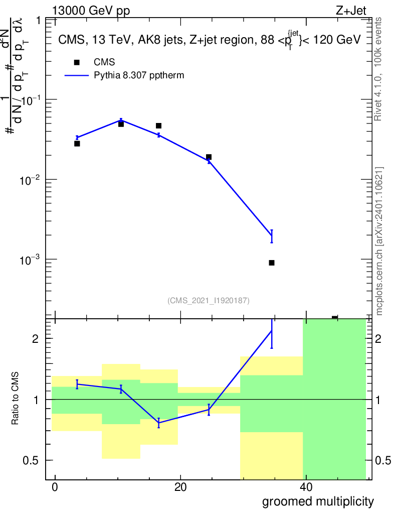Lines: data, pythia8 8.307 pptherm |