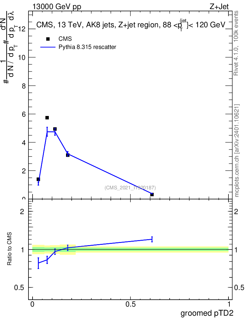 Lines: data, pythia8 8.315 rescatter |