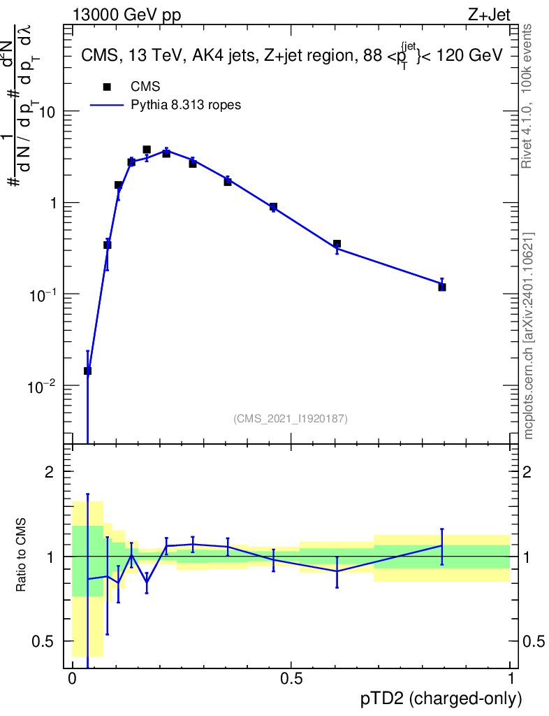 Lines: data, pythia8 8.313 ropes |