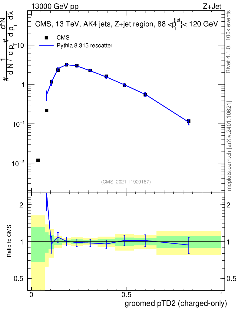 Lines: data, pythia8 8.315 rescatter |
