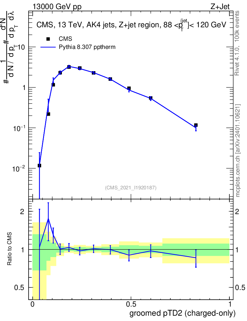 Lines: data, pythia8 8.307 pptherm |