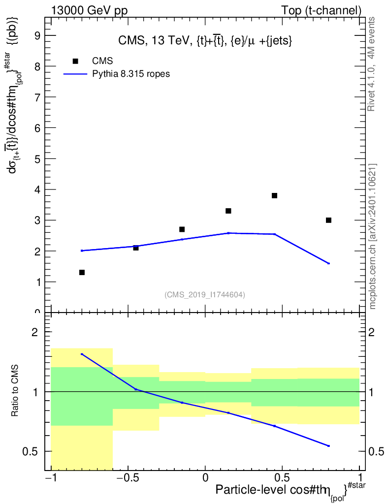 Lines: data, pythia8 8.315 ropes |