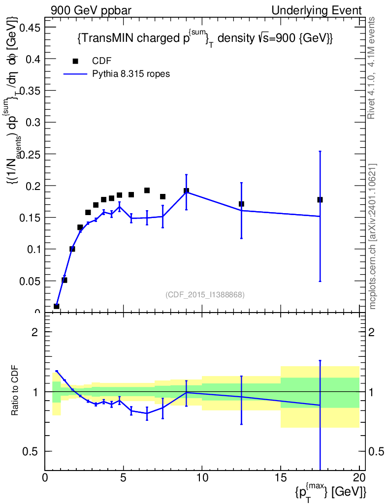 Lines: data, pythia8 8.315 ropes |