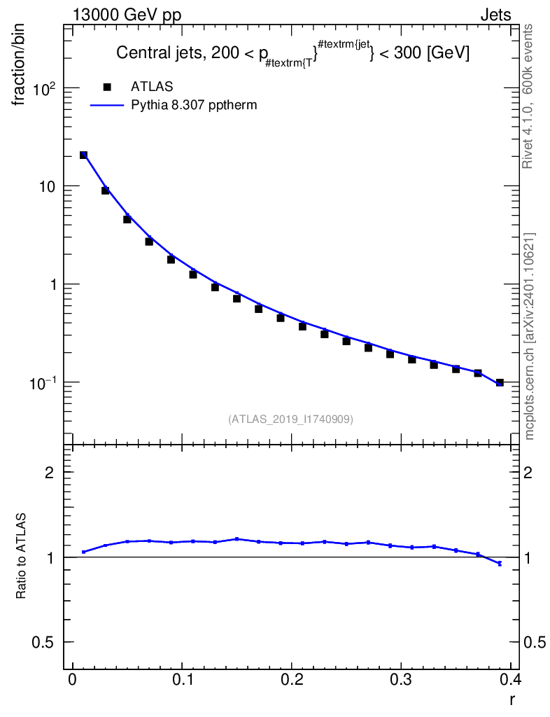 Lines: data, pythia8 8.307 pptherm |
