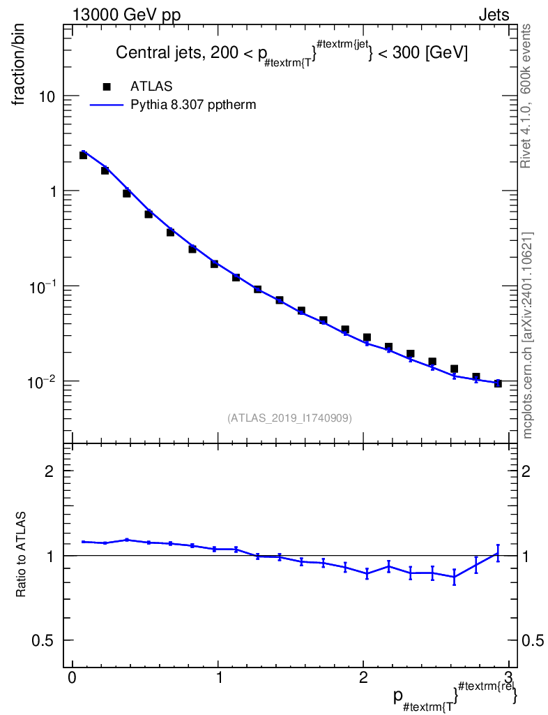 Lines: data, pythia8 8.307 pptherm |