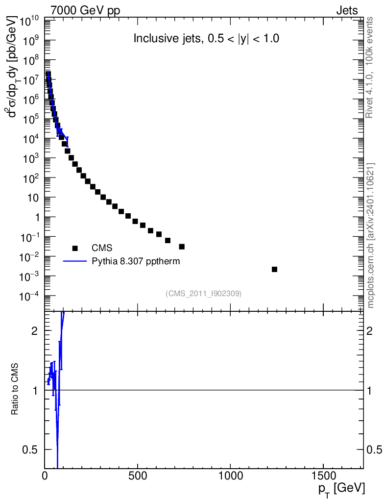 Lines: data, pythia8 8.307 pptherm |
