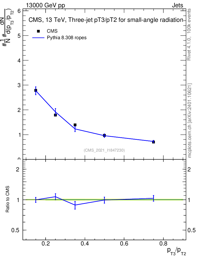 Lines: data, pythia8 8.308 ropes |