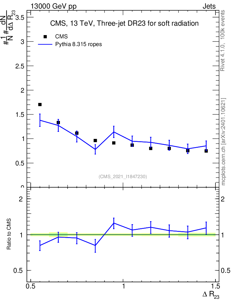 Lines: data, pythia8 8.315 ropes |