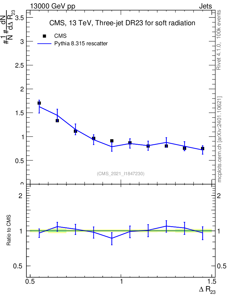 Lines: data, pythia8 8.315 rescatter |