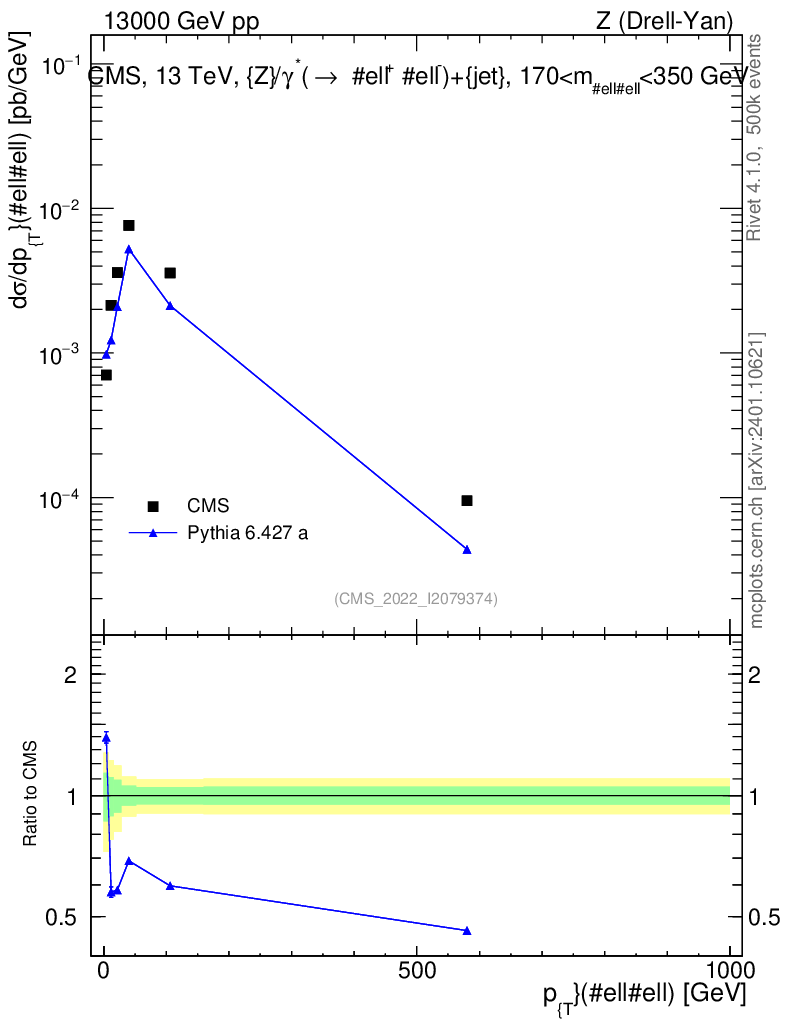 Lines: data, pythia6 6.427 a |