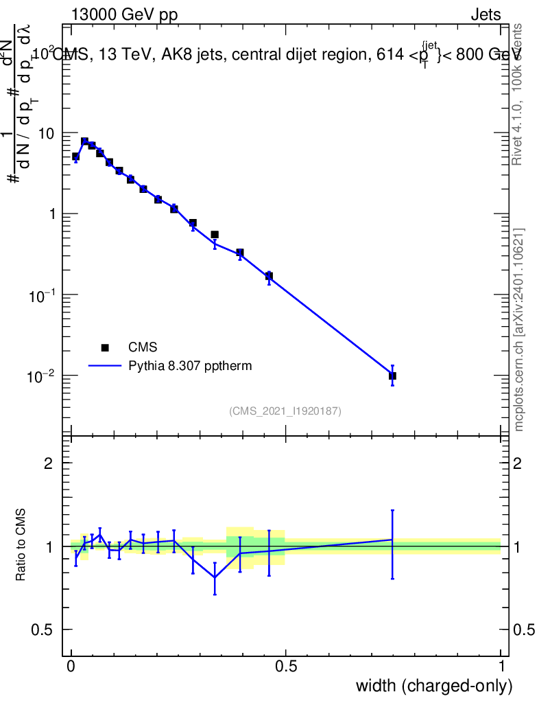 Lines: data, pythia8 8.307 pptherm |