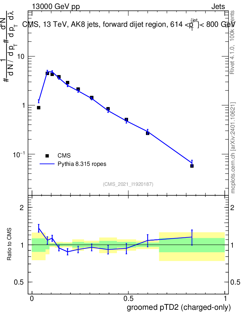 Lines: data, pythia8 8.315 ropes |