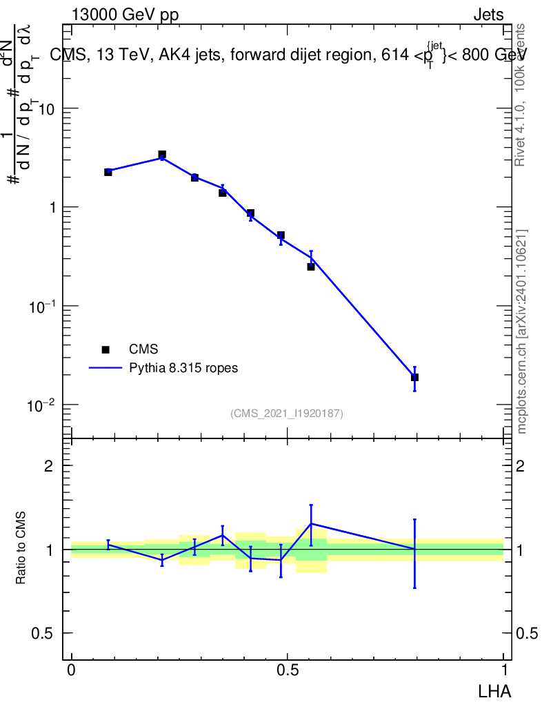 Lines: data, pythia8 8.315 ropes |