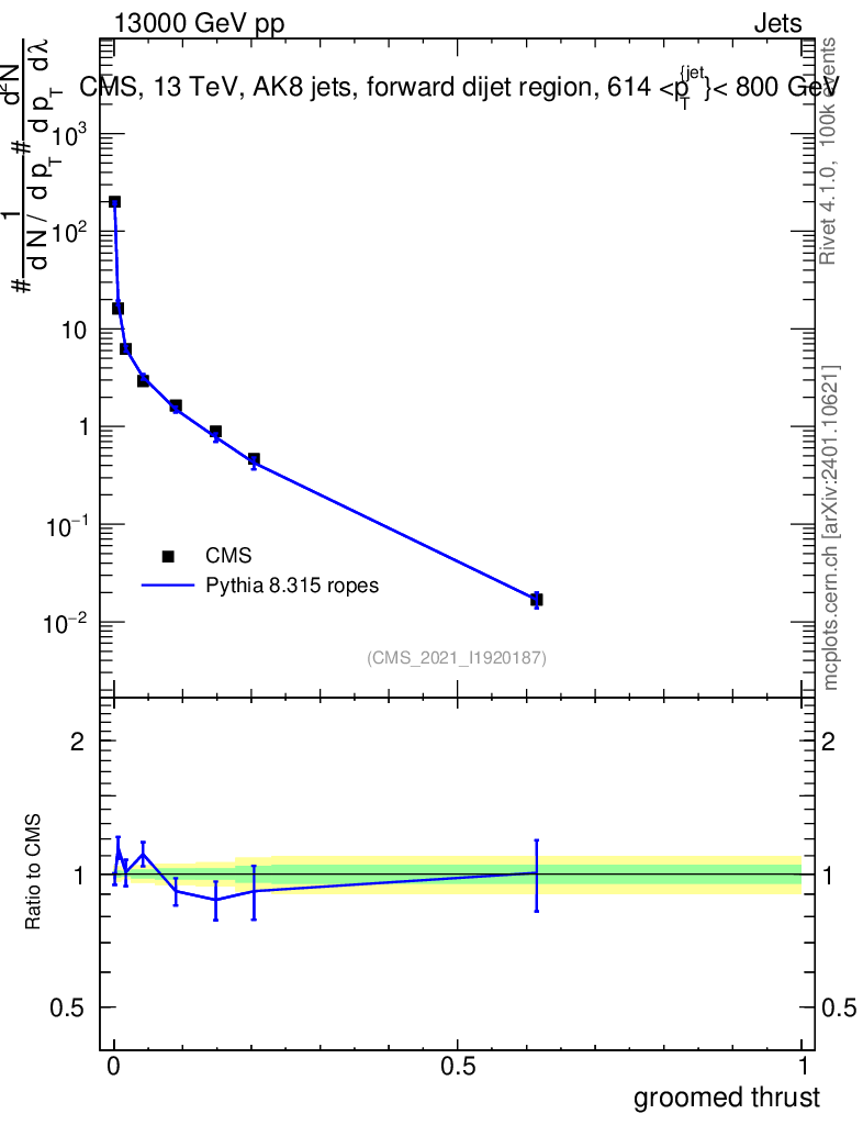 Lines: data, pythia8 8.315 ropes |